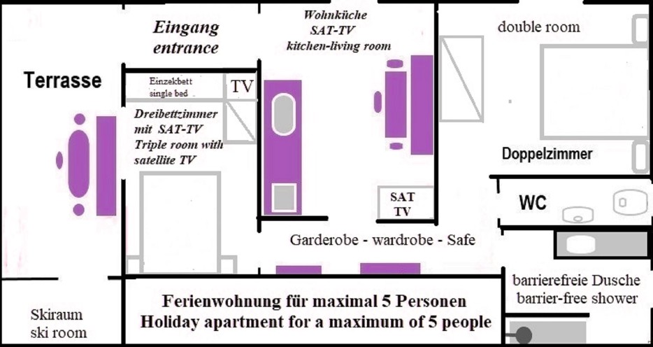 Our 75 m² holiday apartment for 1–5 people has a separate entrance, Meadow and terrace exclusively for your use,